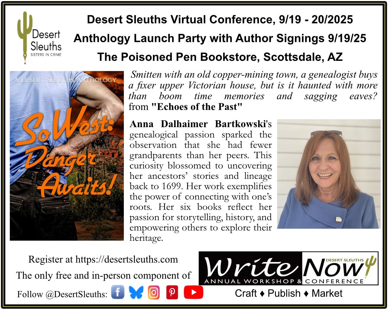 My latest short story, Echoes of the Past, debuts on September 19 in the new Desert Sleuths Anthology. Join us a the launch party that Friday at Poisoned Pen Bookstore!